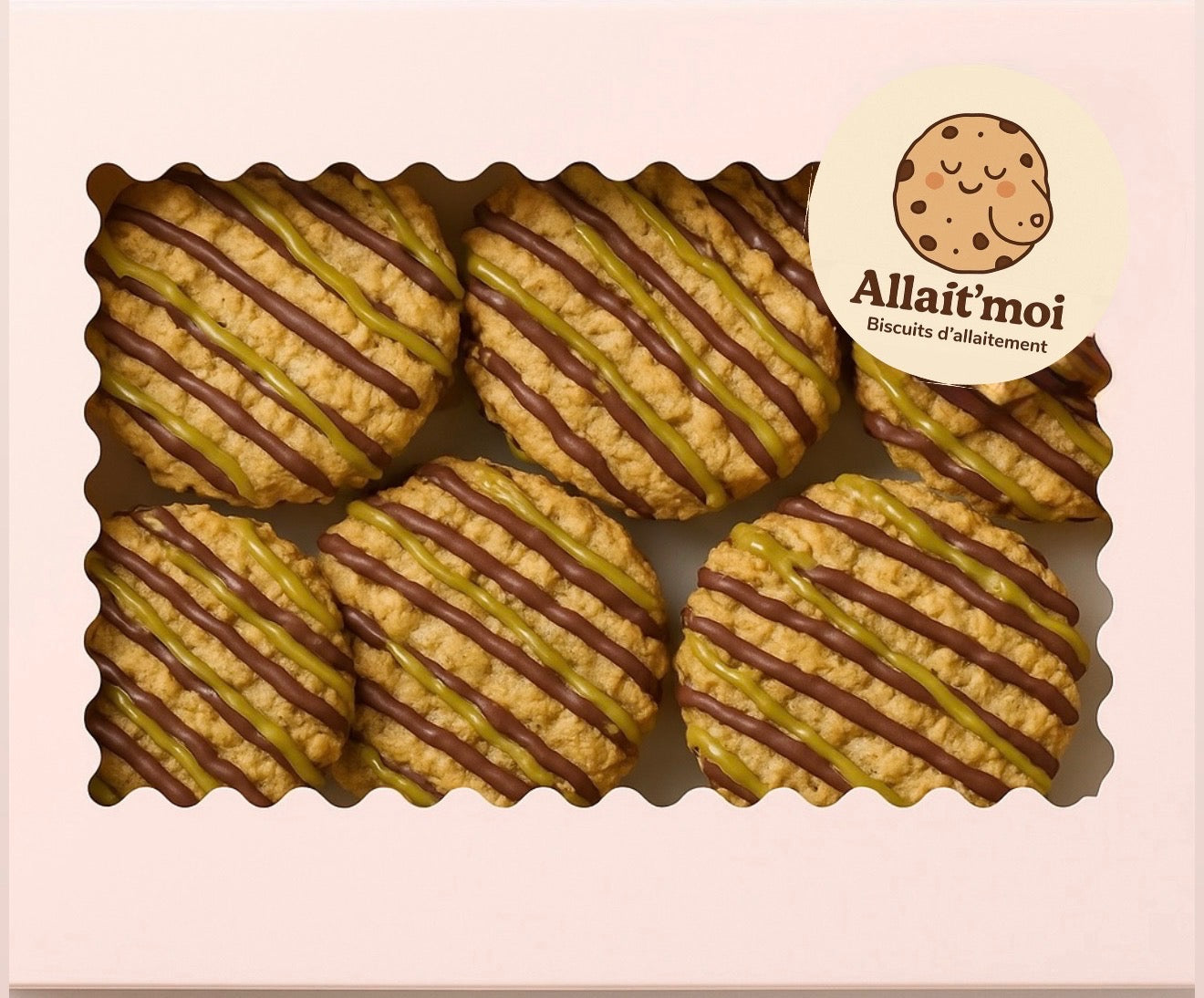 Ingrédients: Flocons d’avoine à grains entiers, farine de blé blanchie enrichie (farine de blé, niacine,fer, thiamine, riboflavine, acide folique), sucre, levure de bière, Crème de pistaches (Pistaches, sucre, lait en poudre, huile d’olive, beurre de cacao, léchitine de soja),brisures de chocolat semi-sucrées (sucre, cacao, léchitine de soya, vanille), beurre (crème, sel), cannelle, sel.